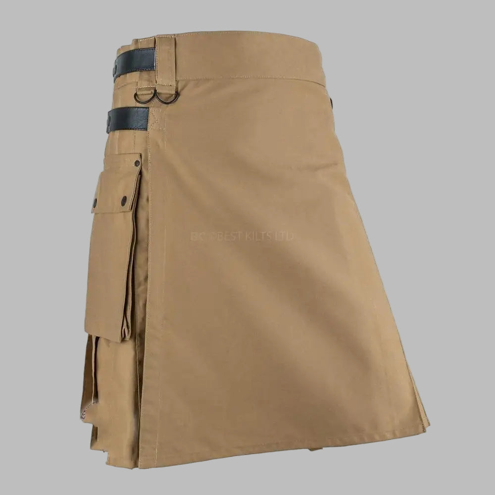 Beige steampunk-kilt nahkahihnoilla ja soljilla
