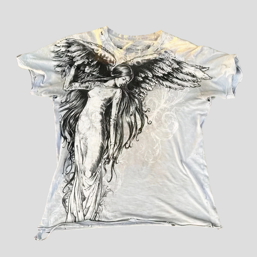 Valkoinen Affliction metal‑T-paita enkelisiiviprintillä, koko 3XL