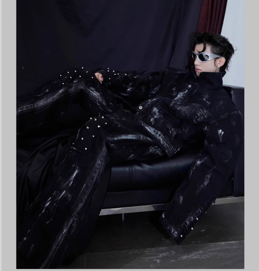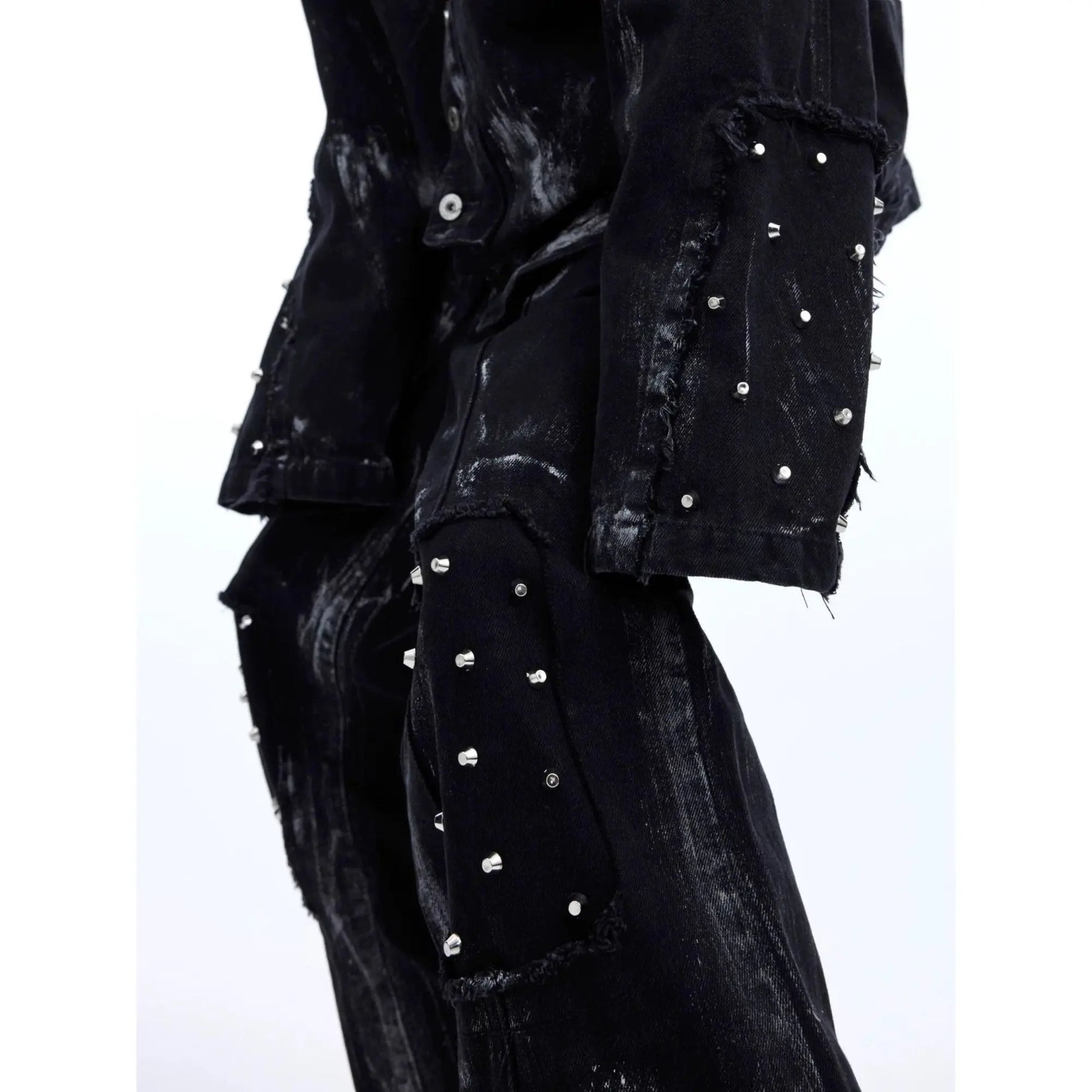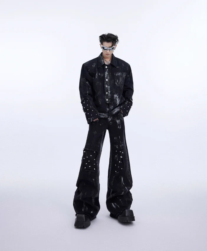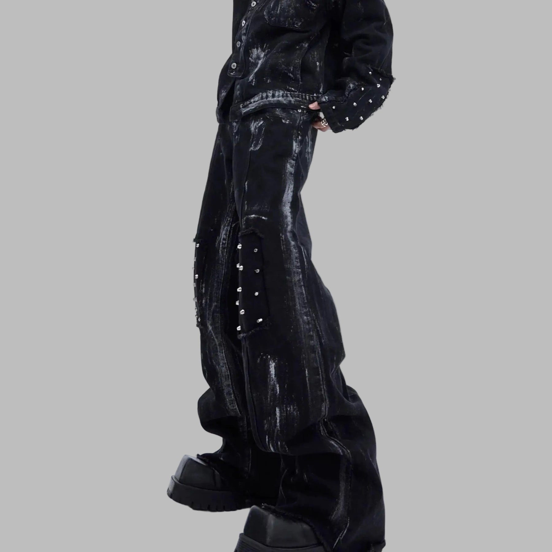 Gotyckiset mustat oversize-grungehousut, niittejä ja repeämiä, vintage-tyyli