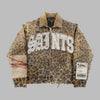 Grunge-tyylinen farkkutakki leopardikuviolla ja rock/metal-teksteillä
