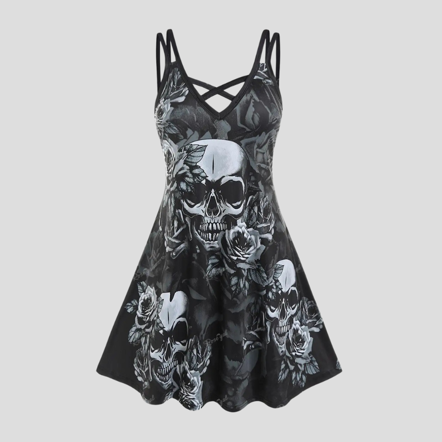 Harmaa Metal-kallo- ja ruusukuviollinen rockmekko, koko 5XL