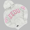Harmaa oversize GEEDUP-rockhuppari vaaleanpunaisella tekstillä