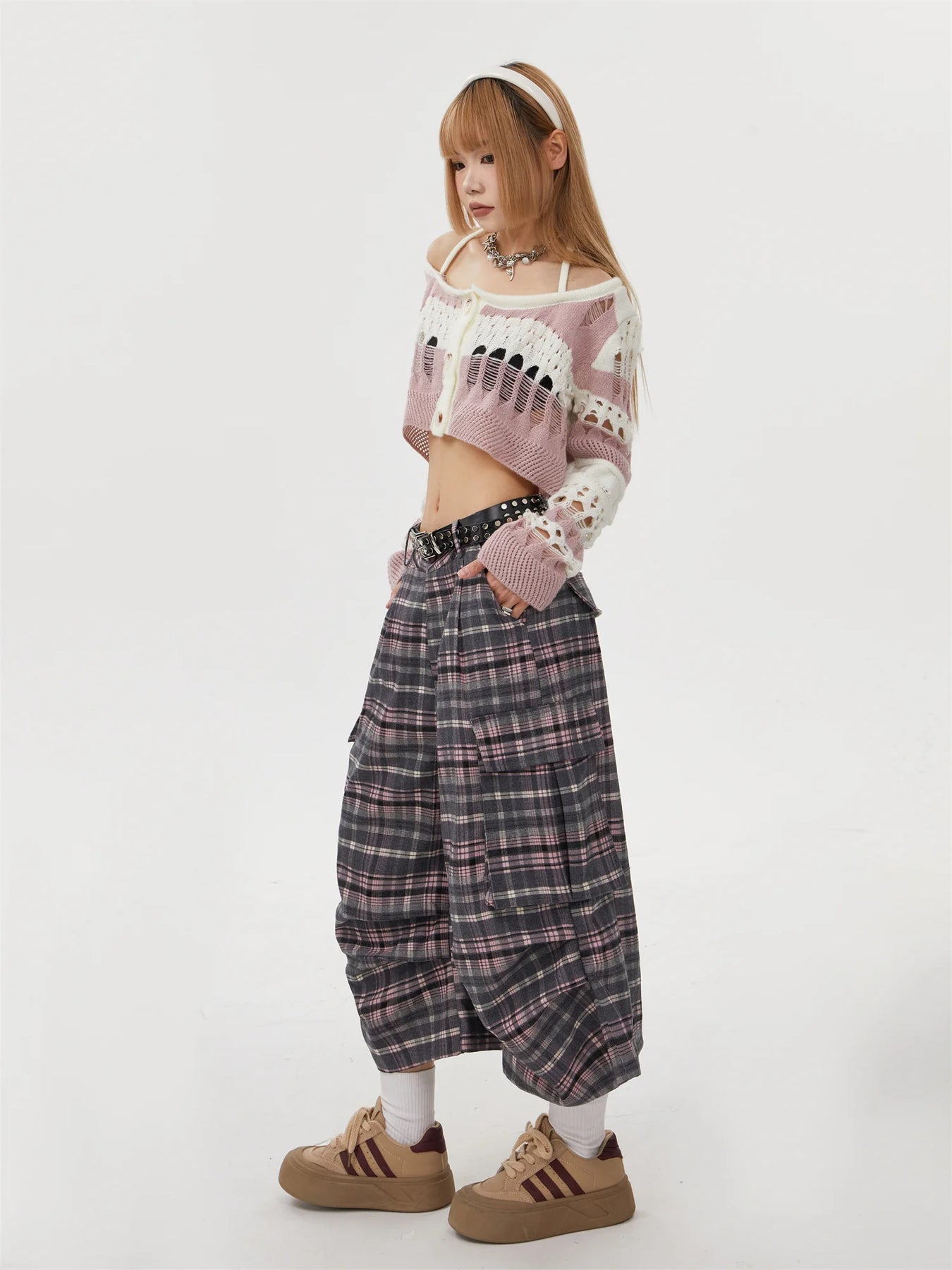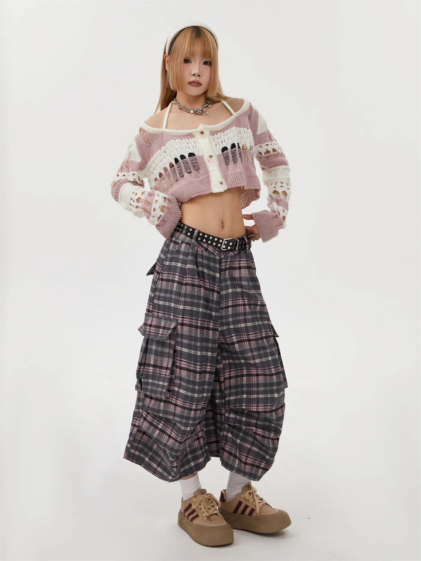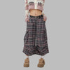 Harmaan ja vaaleanpunaisen ruudulliset punk rock -housut pitsikoristeilla