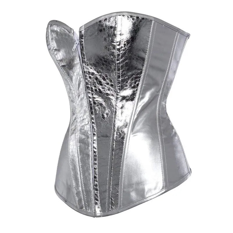Hopeinen metallikorsetti, käärmeennahkakuvio, luutitus, koko 7XL