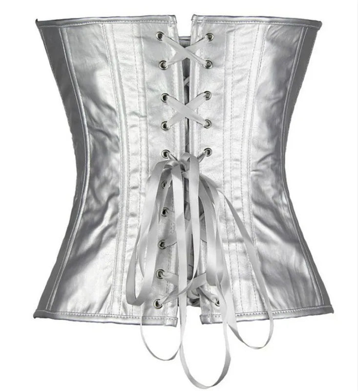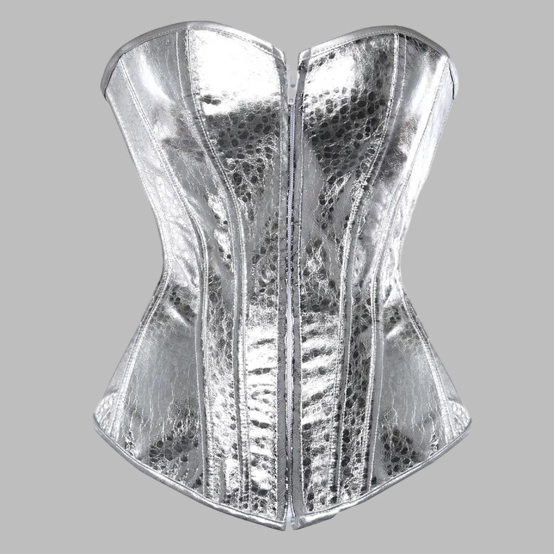 Hopeinen metallikorsetti käärmeennahkakuviolla ja luilla