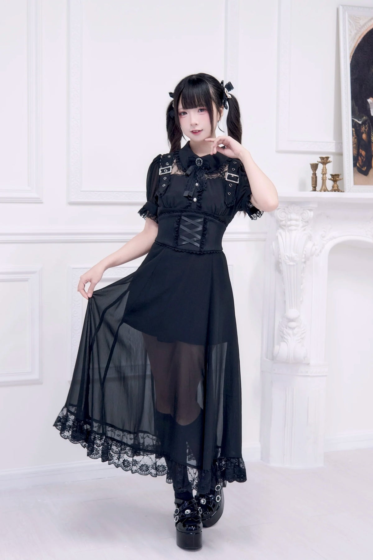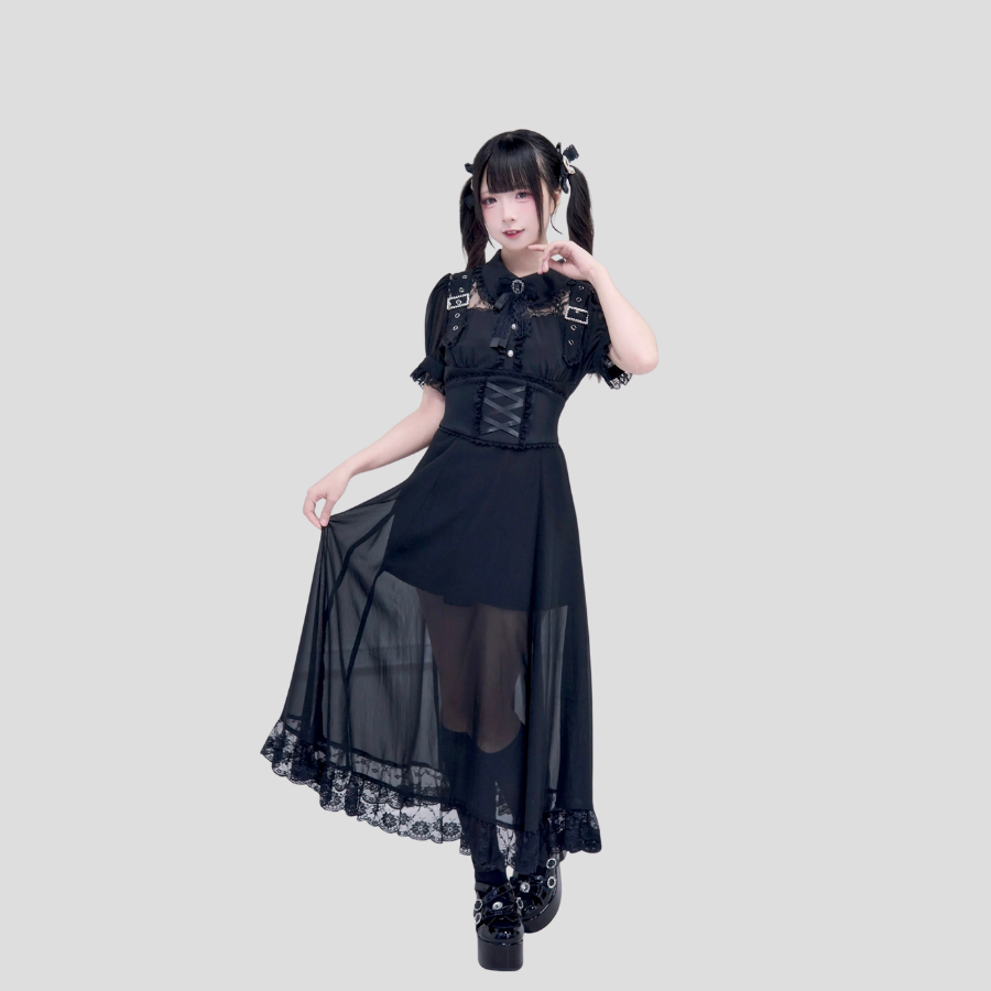 Jirai Kei pitkä musta kawaii mekko korsetilla