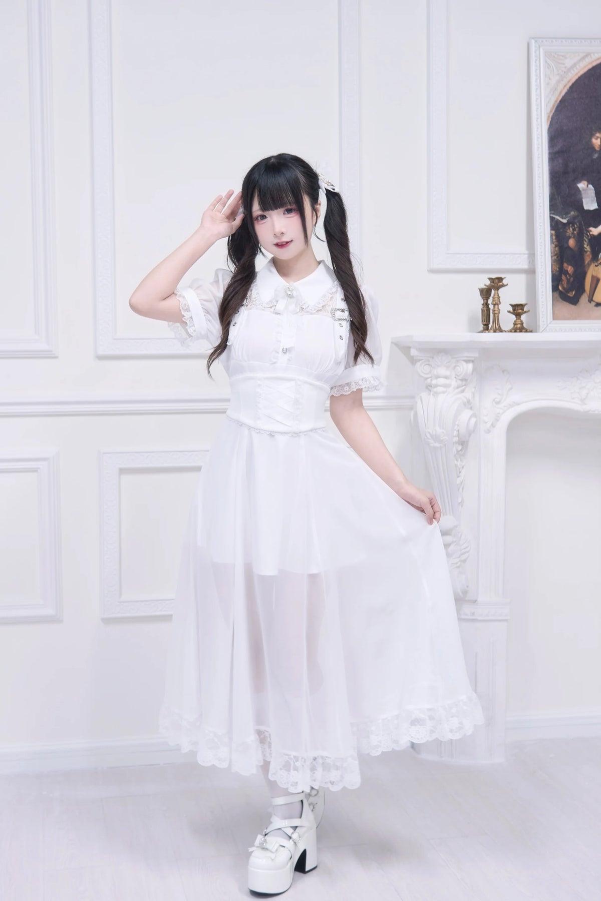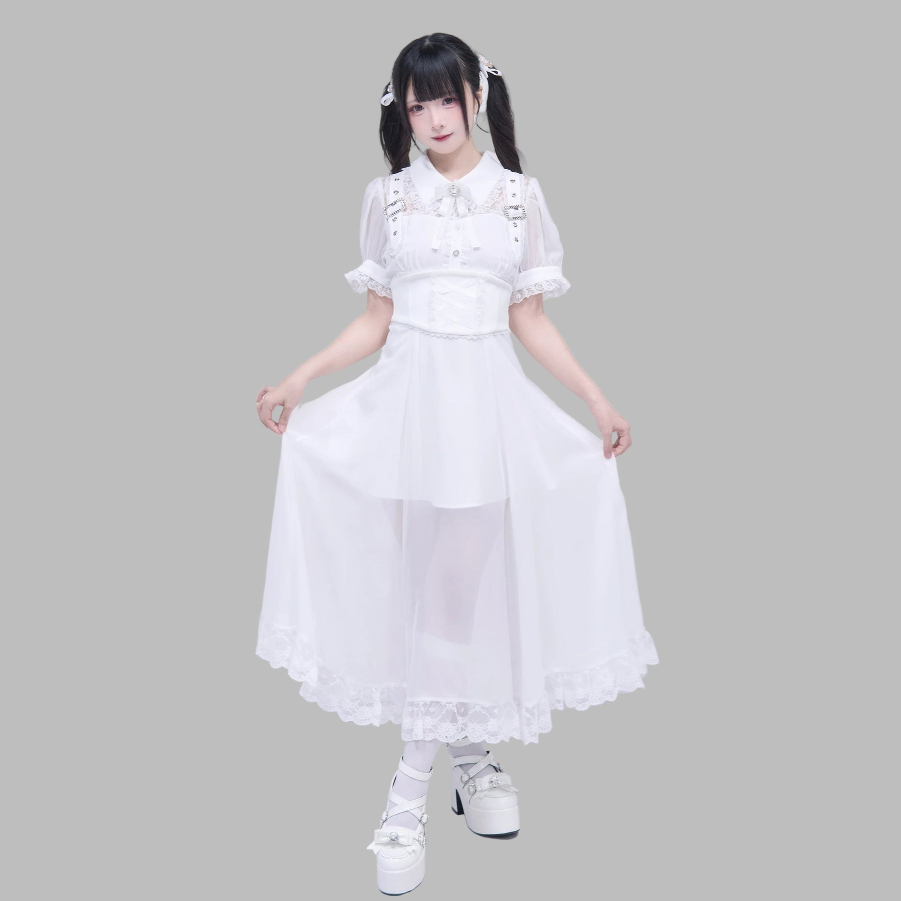 Jirai Kei pitkä valkoinen röyhelömekko, kawaii