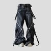 Męskie czarne cargo-housut, vetoketjut ja remmit, taskut, punk techwear