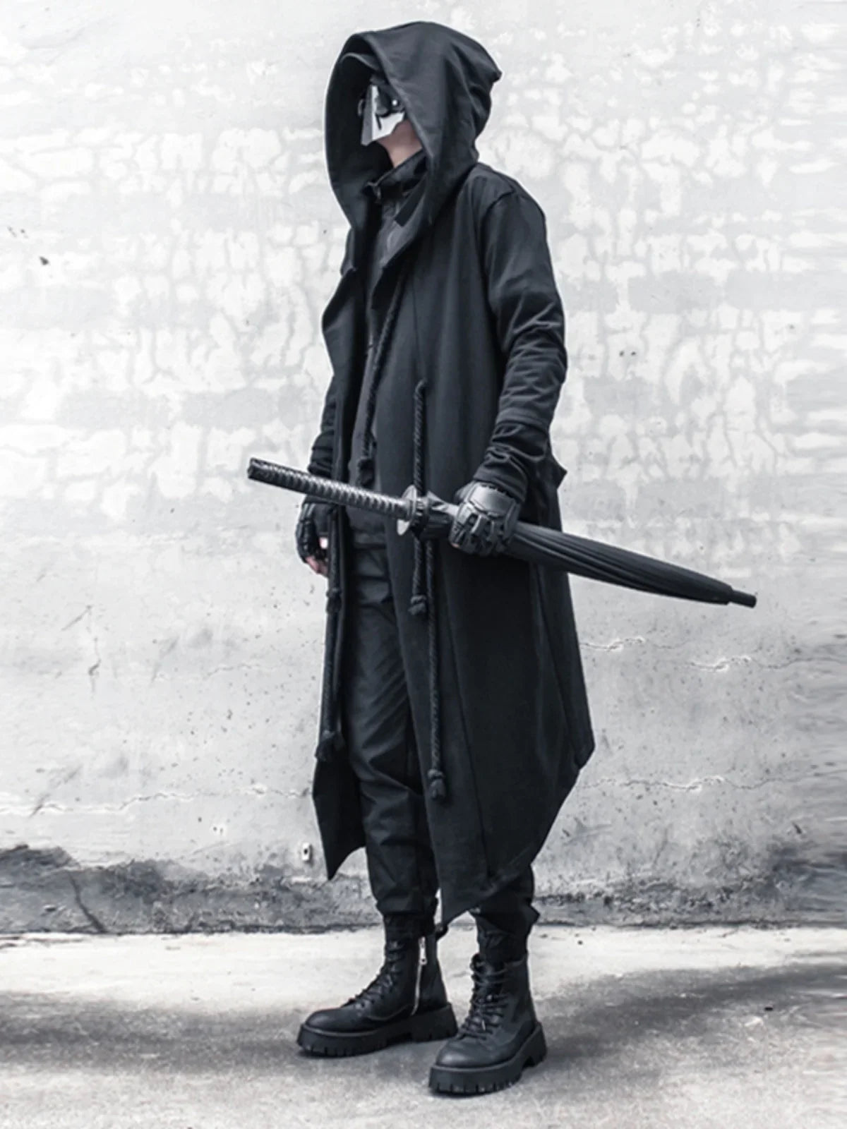 Miesten pitkä musta hupputakki – techwear-tyyli