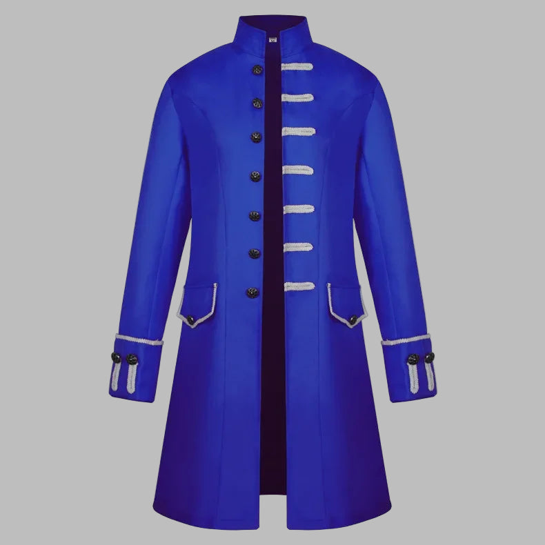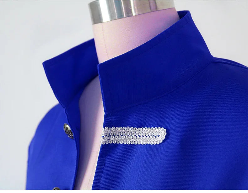 Miesten sininen steampunk-takki valkoisilla koriste­nauhoilla