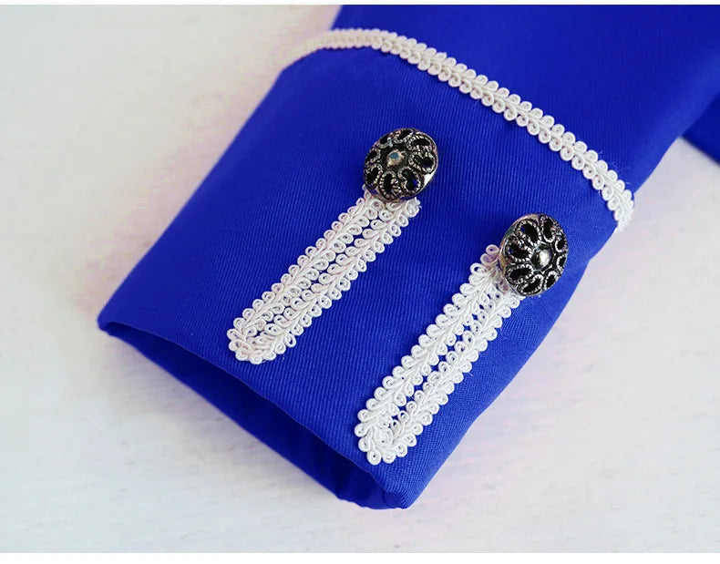Miesten sininen steampunk-takki valkoisilla koristeköysillä