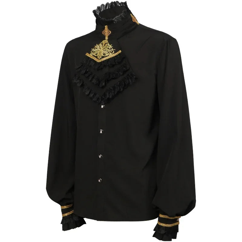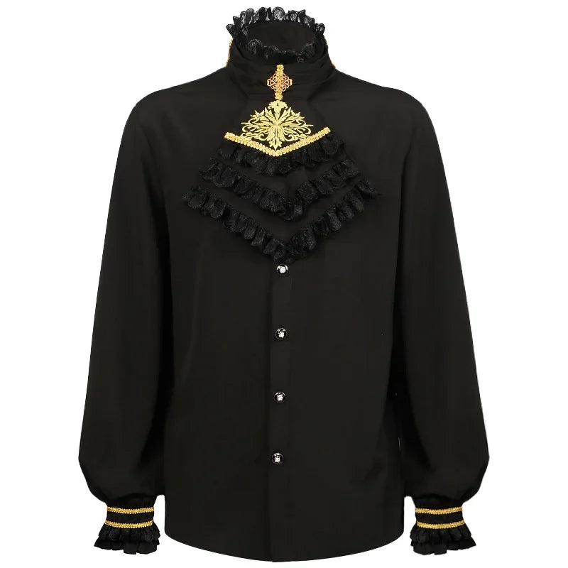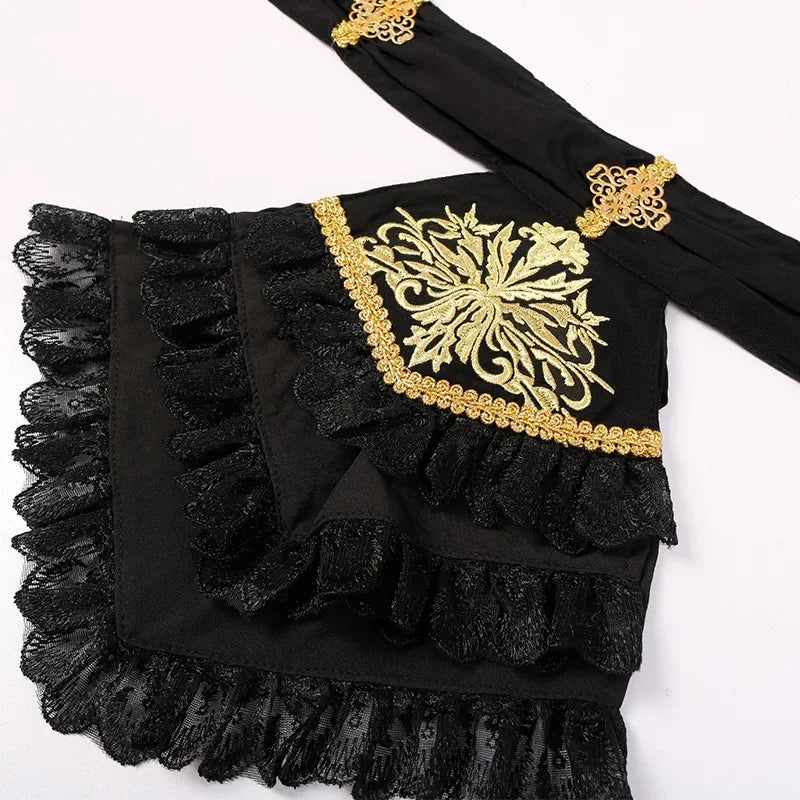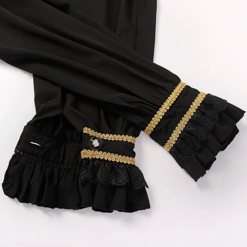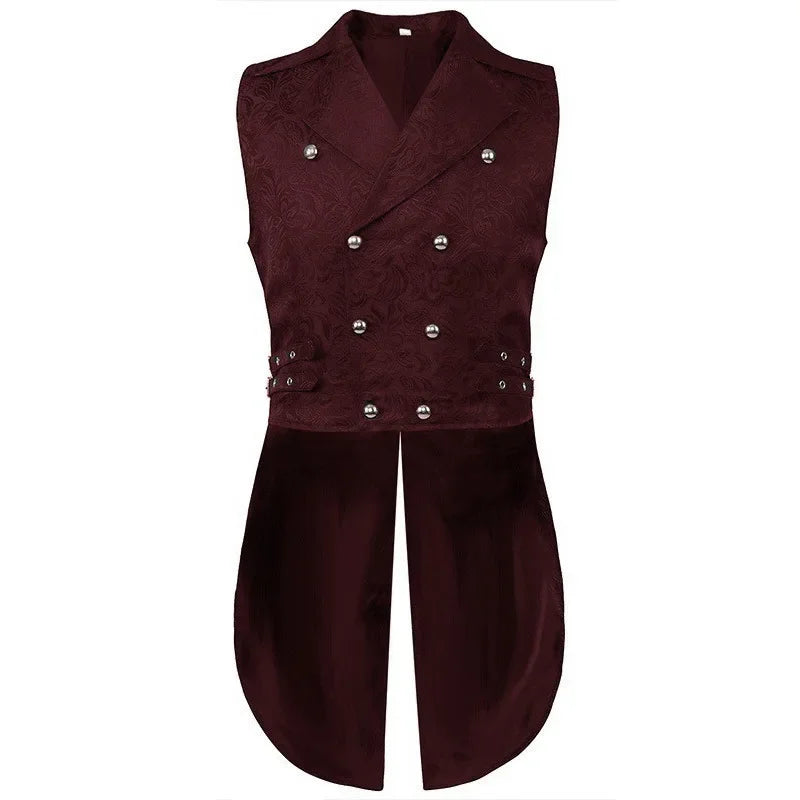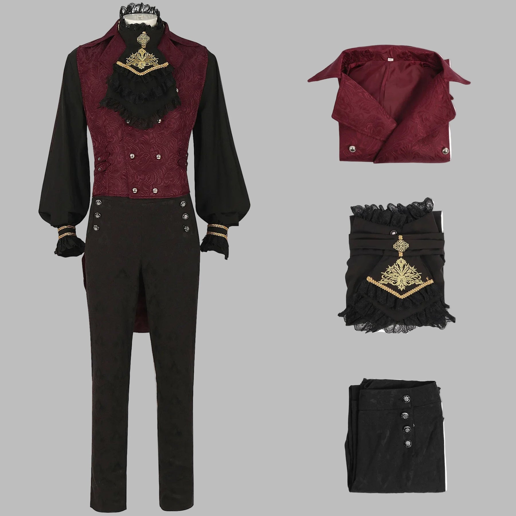 Miesten steampunk-asu, viininpunainen–musta pitsillä ja kultaisilla yksityiskohdilla