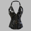 Musta goottihenkinen steampunk-korsetti olkaimella ja metalliyksityiskohdilla