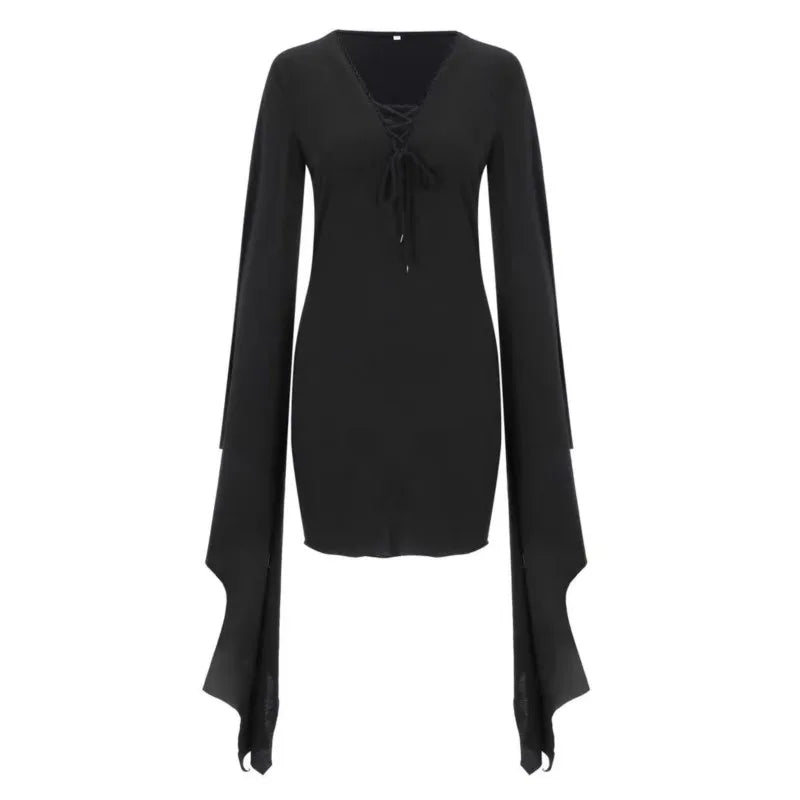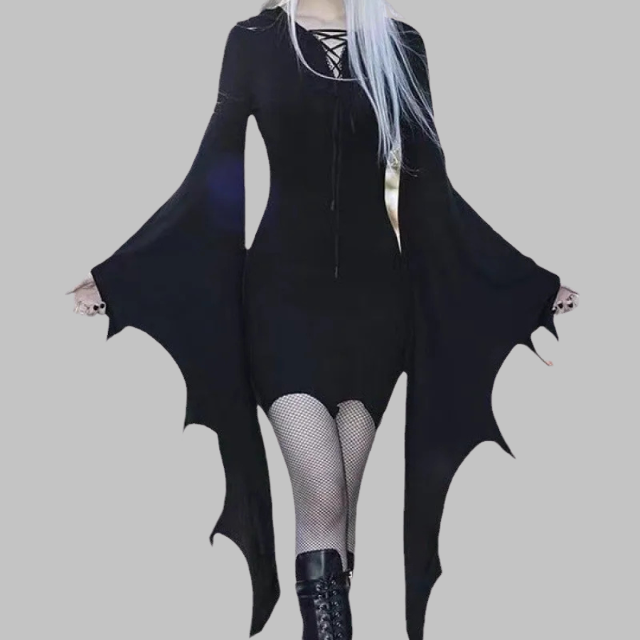 Musta goottityylinen lepakkomekko siipimäisillä hihoilla