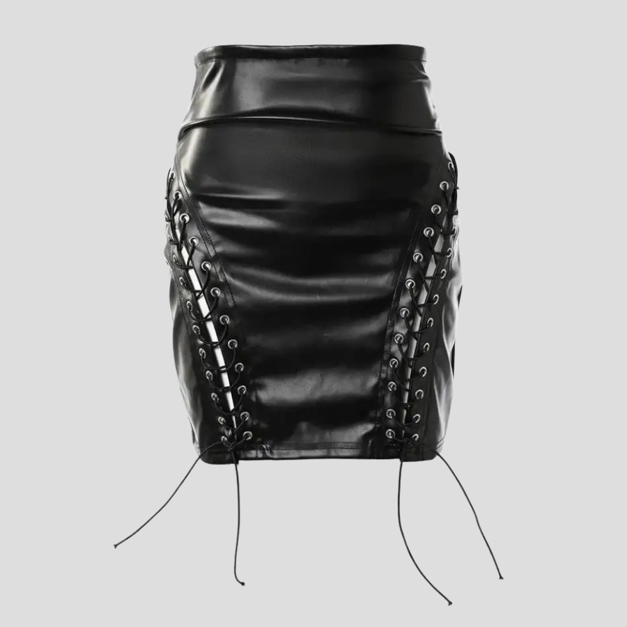 Musta goottityylinen nahkahame, lyhyt ja kapealinjainen nyörityksellä