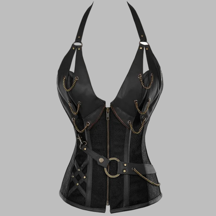 Musta goottityylinen punk-korsetti ketjuilla ja nahkayksityiskohdilla