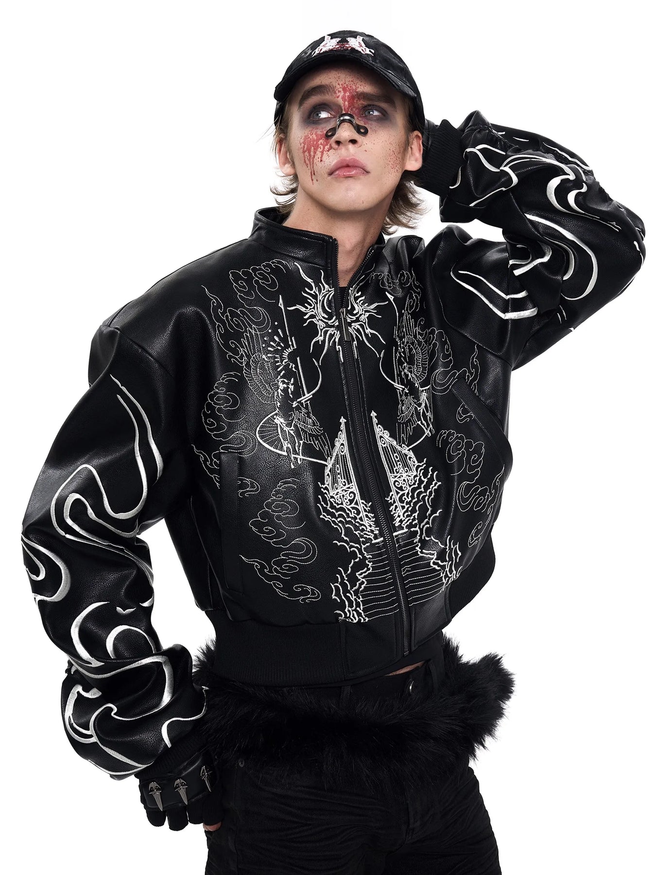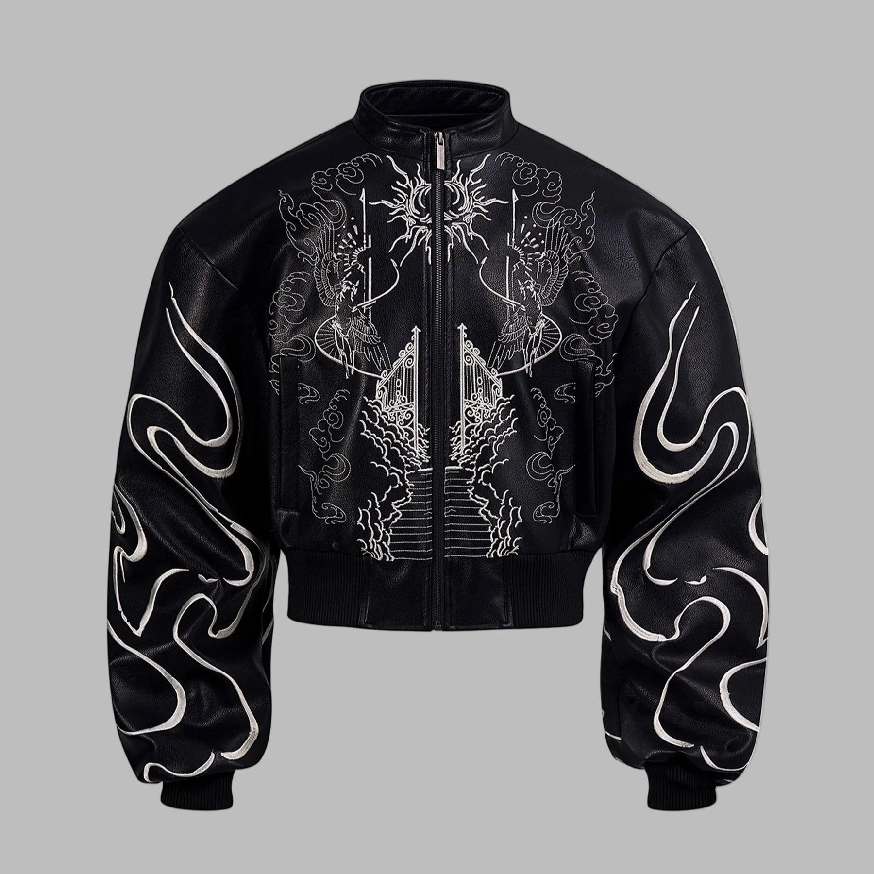 Musta goth metal -tyylinen bomber-takki, enkelitaivas-brodeerauksella