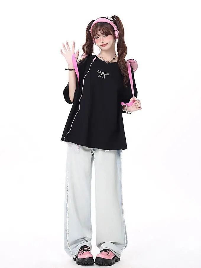 Musta Jirai Kei ‑huppari selän nyörityksellä ja vaaleanpunaisella nauhalla