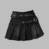 Musta laskostettu punk-minihame metallisilla remmeillä ja niiteillä