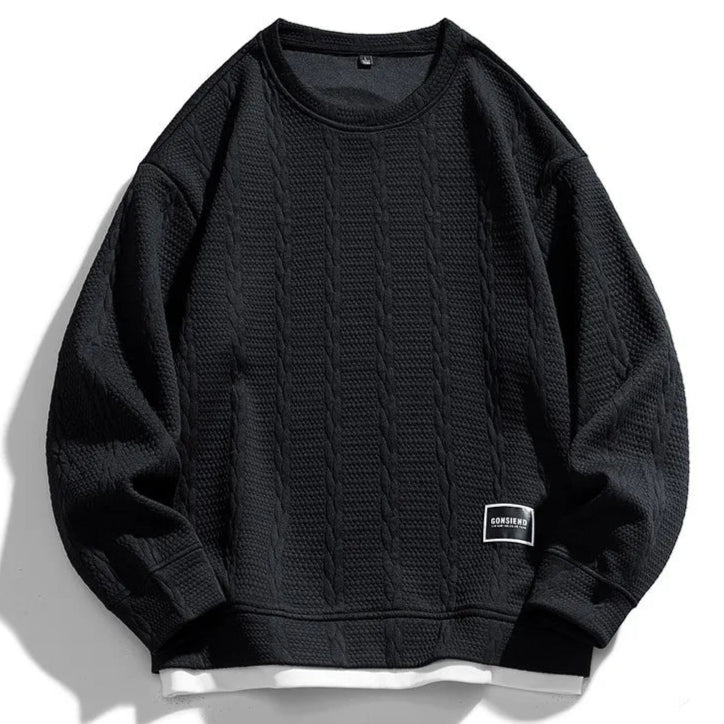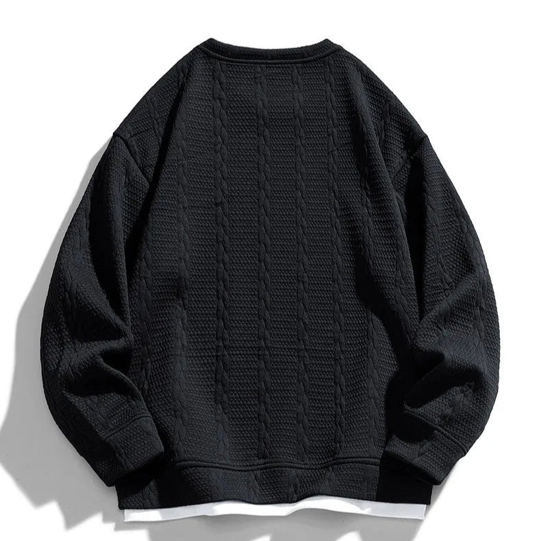 Musta oversize‑neule taskuilla, grunge-tyyli