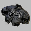 Musta oversize punk- ja metallityylinen nahkatakki valkoisilla printeillä