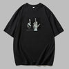 Czarna oversize rock‑T-paita käsielekuvioinnilla