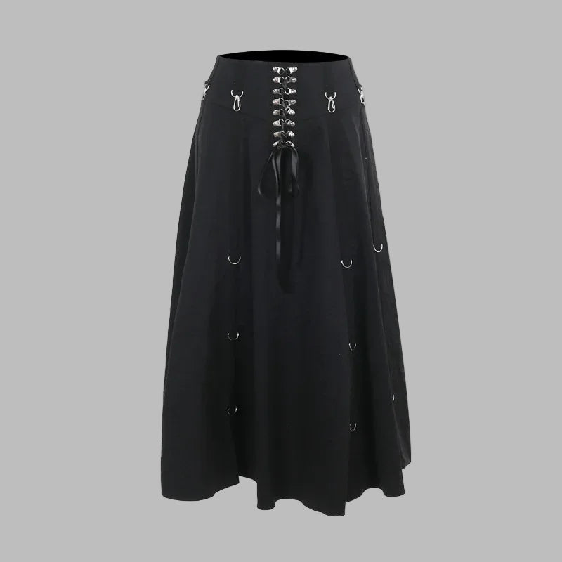 Musta pitkä epäsymmetrinen goottihame korsetilla ja röyhelöillä