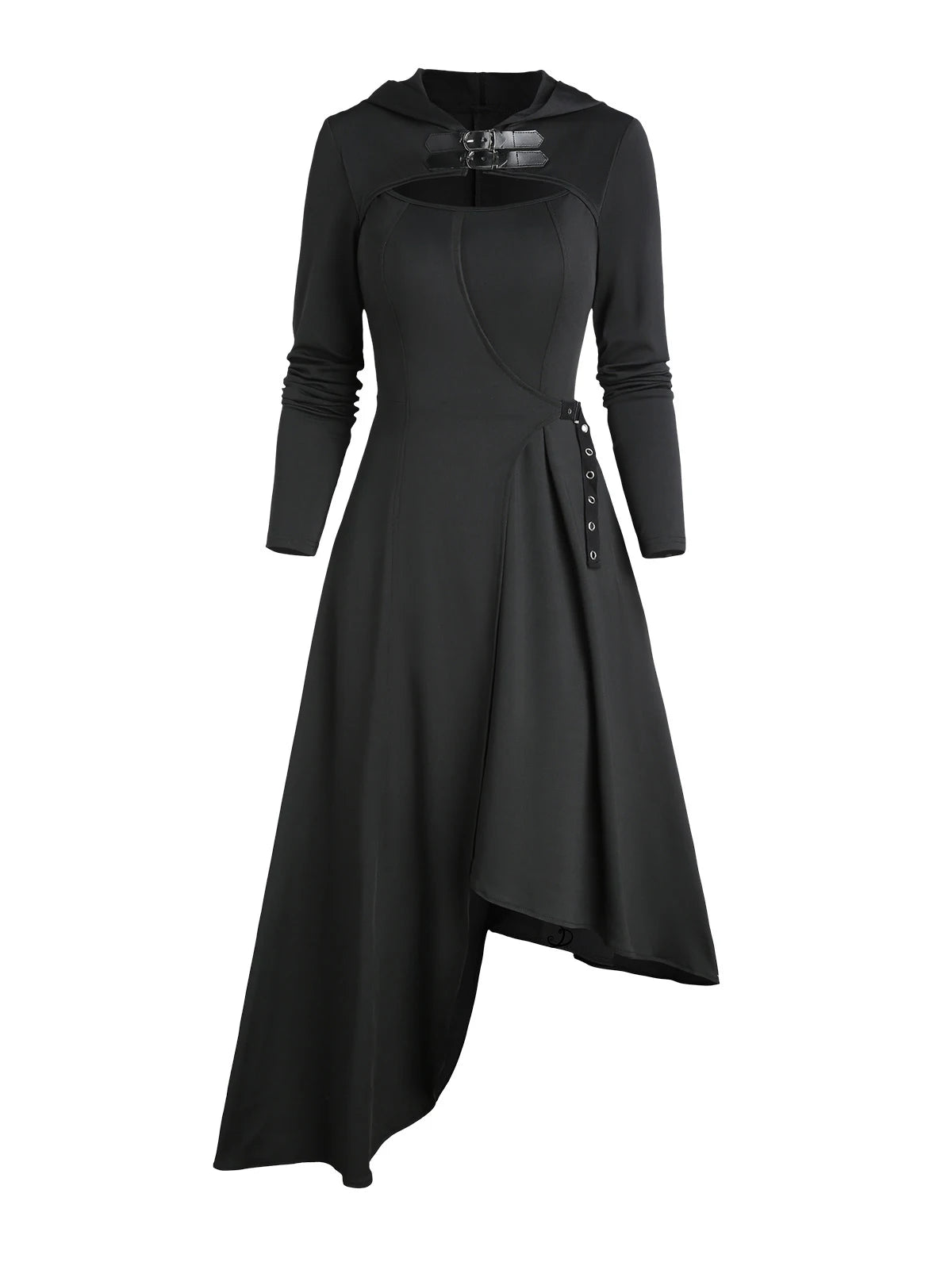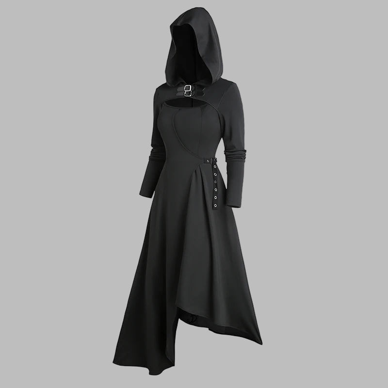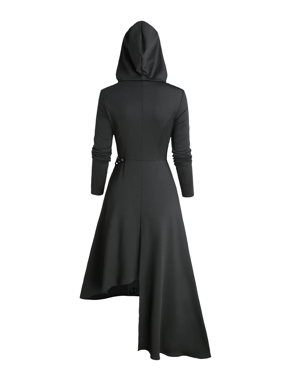 Musta pitkä hupullinen epäsymmetrinen takki vyöllä
