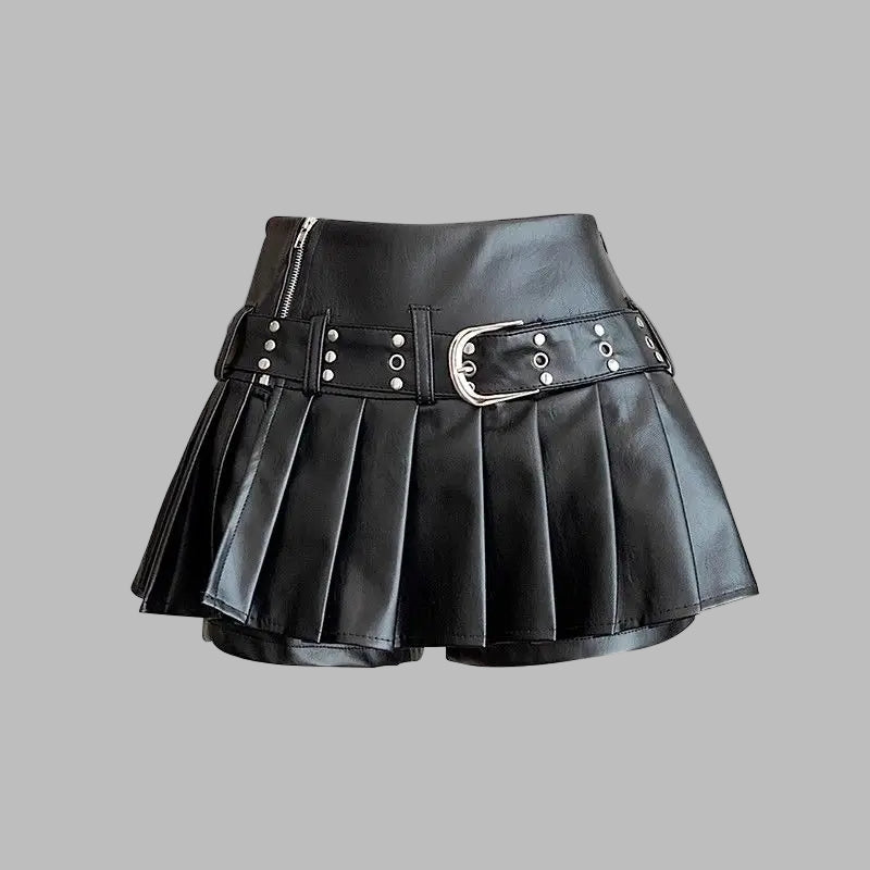 Musta pliseerattu nahkainen minihame metallisella vyöllä