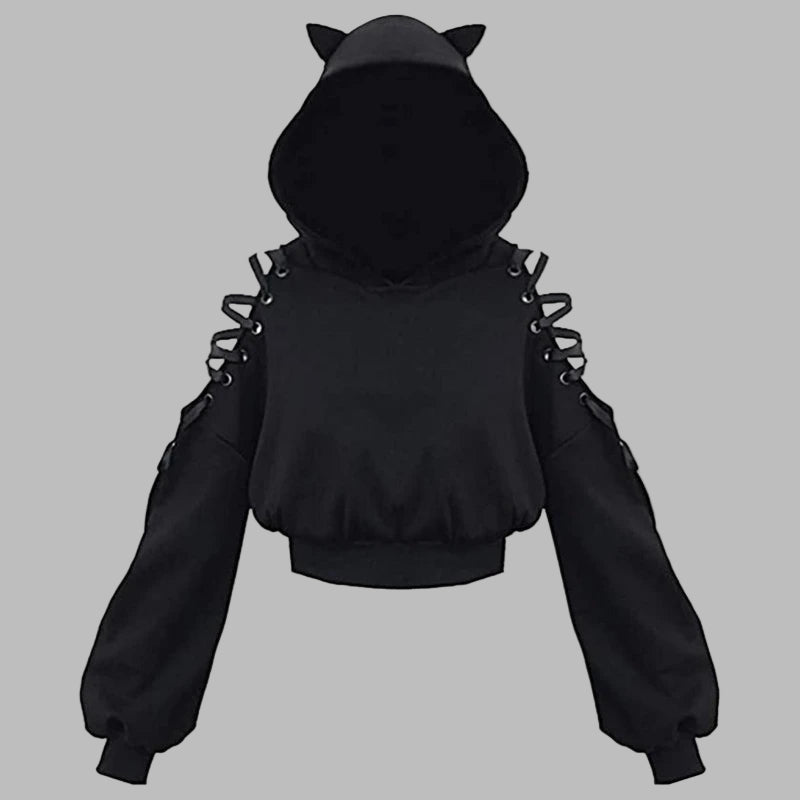 Musta punk-huppari sarvilla ja nyörityksellä olkapäillä