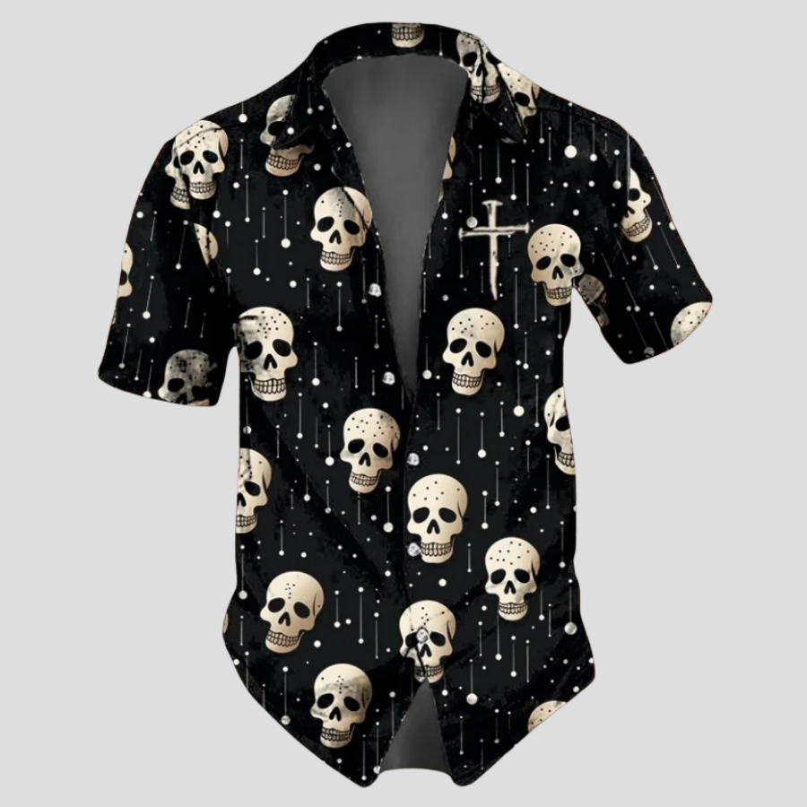 Musta punk-kauluspaita pääkallo- ja ristikuviolla, lyhythihainen