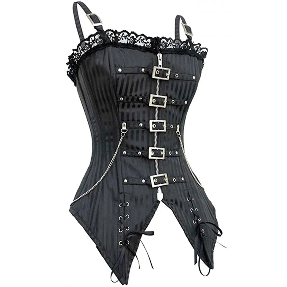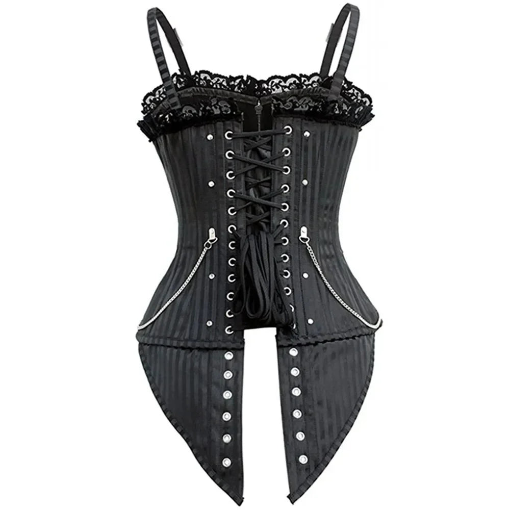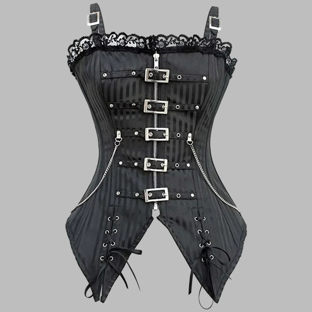 Musta ribbineulottu punk-gothic-korsetti soljilla, niiteillä ja ketjuilla