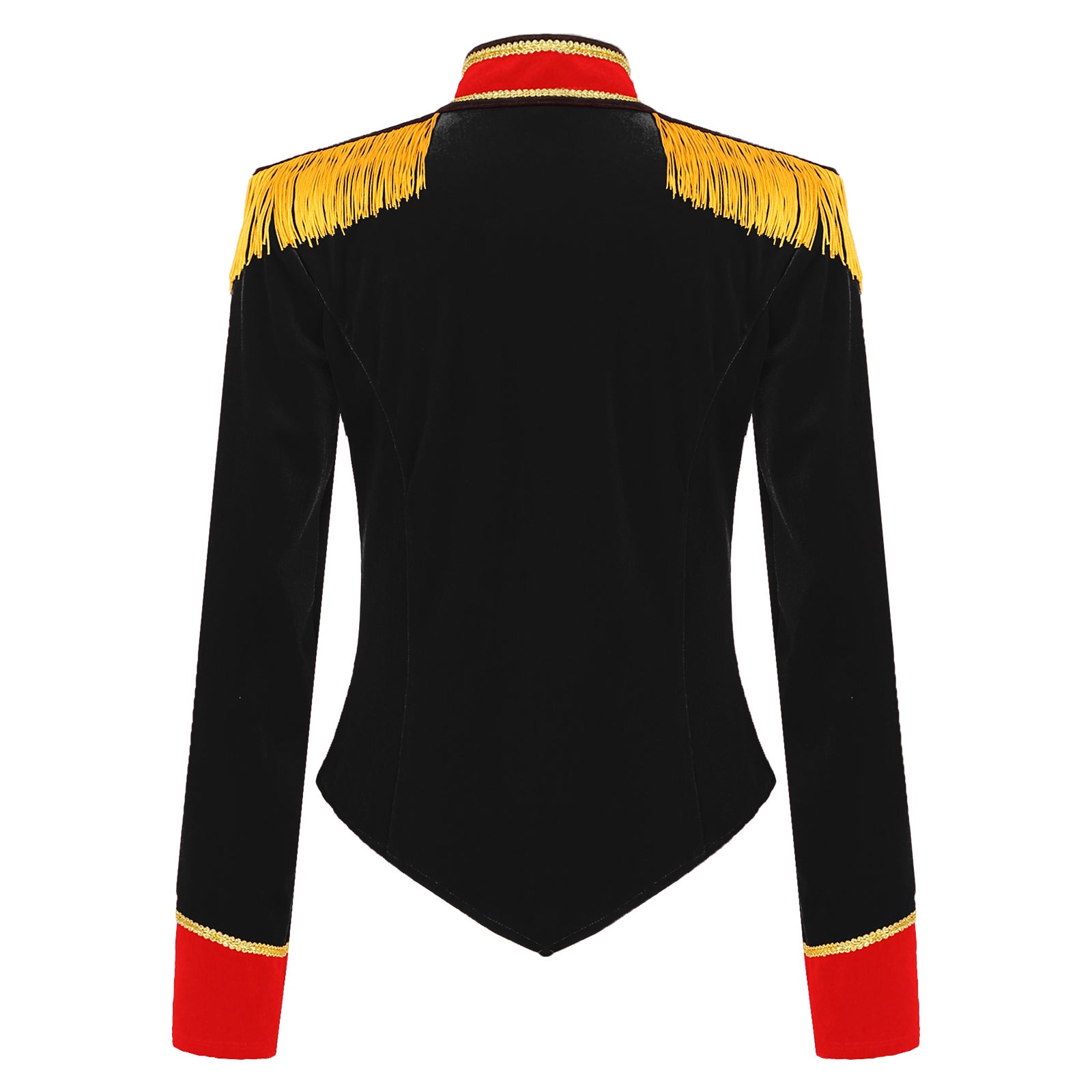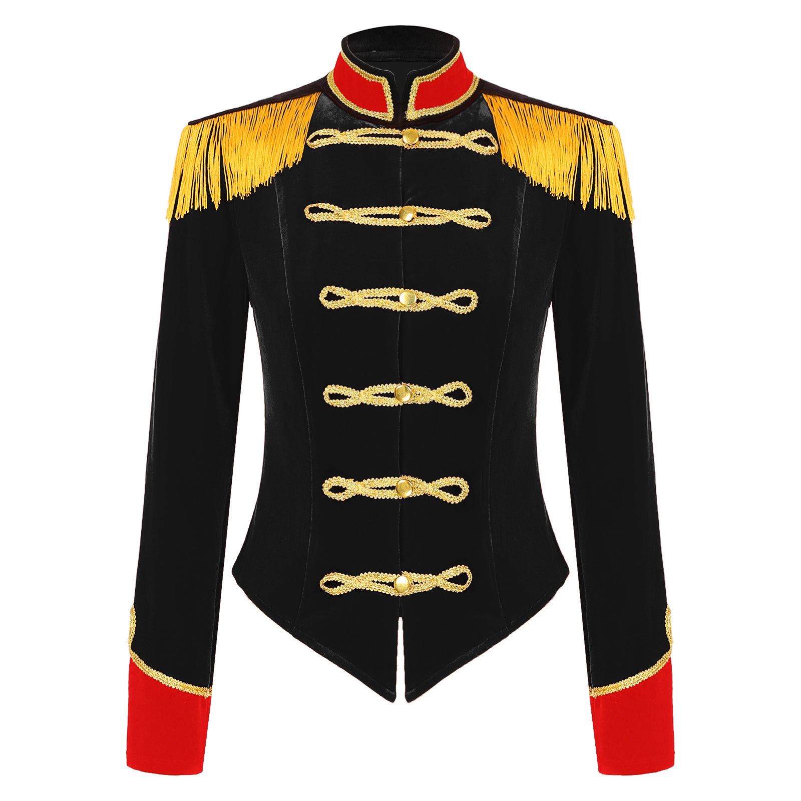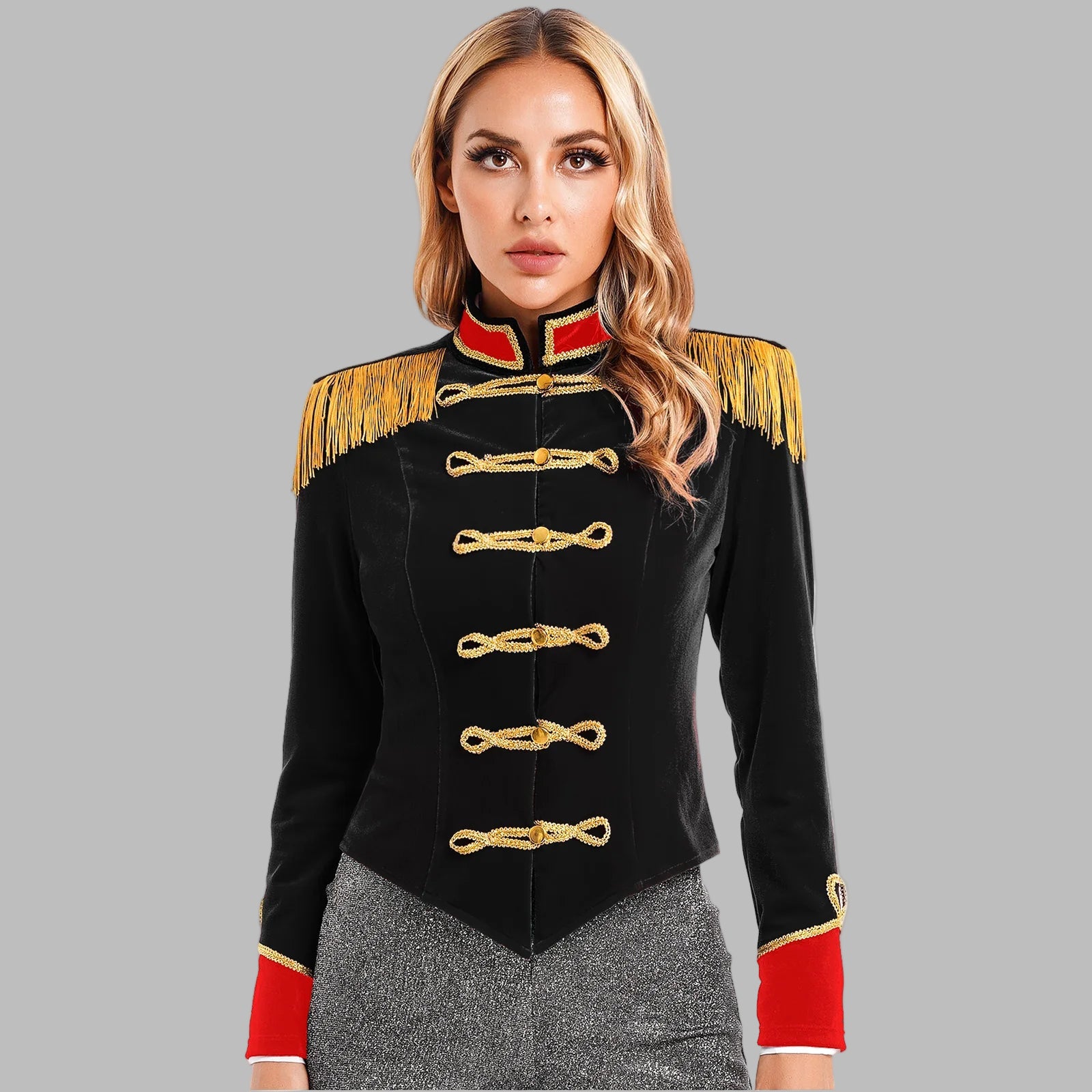 Musta steampunk-tyylinen sotilastakki kultaisilla yksityiskohdilla ja hapsuilla
