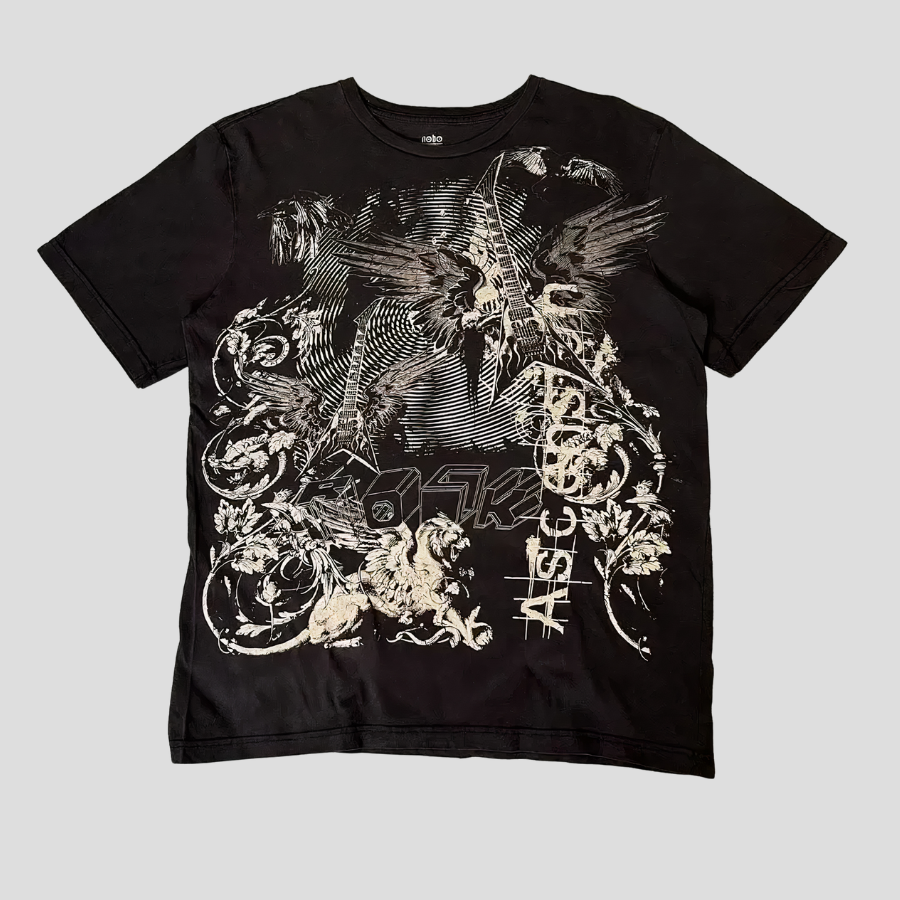 Musta-valkoinen punk‑paita myyttisillä olennoilla ja siivillä