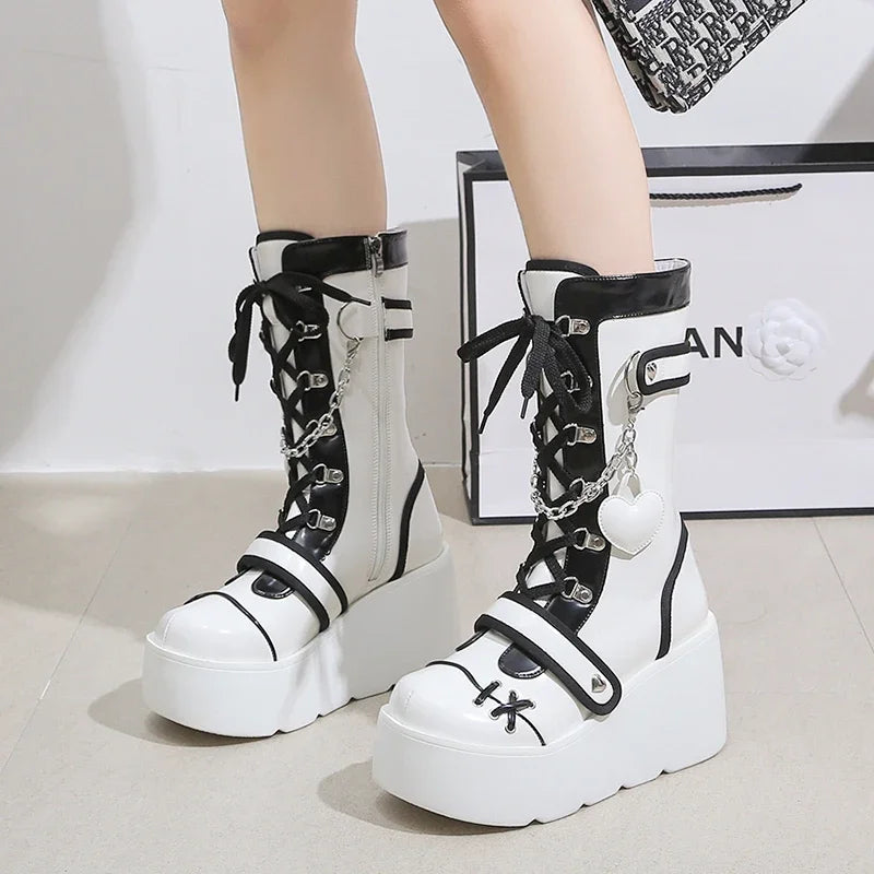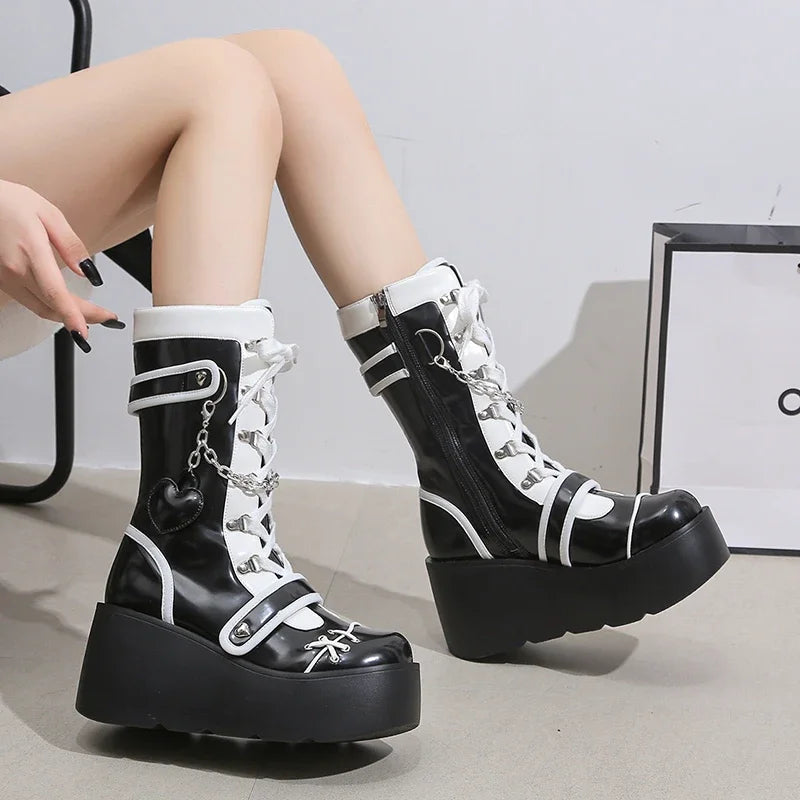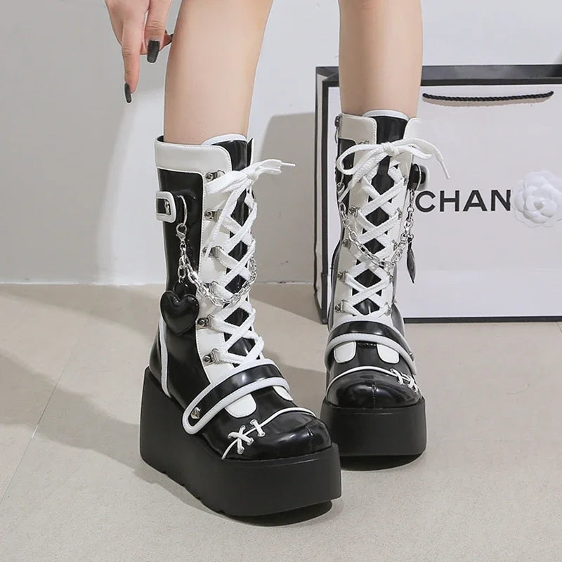 Musta-valkoiset goottilaiset nauhalliset platform-nilkkurit