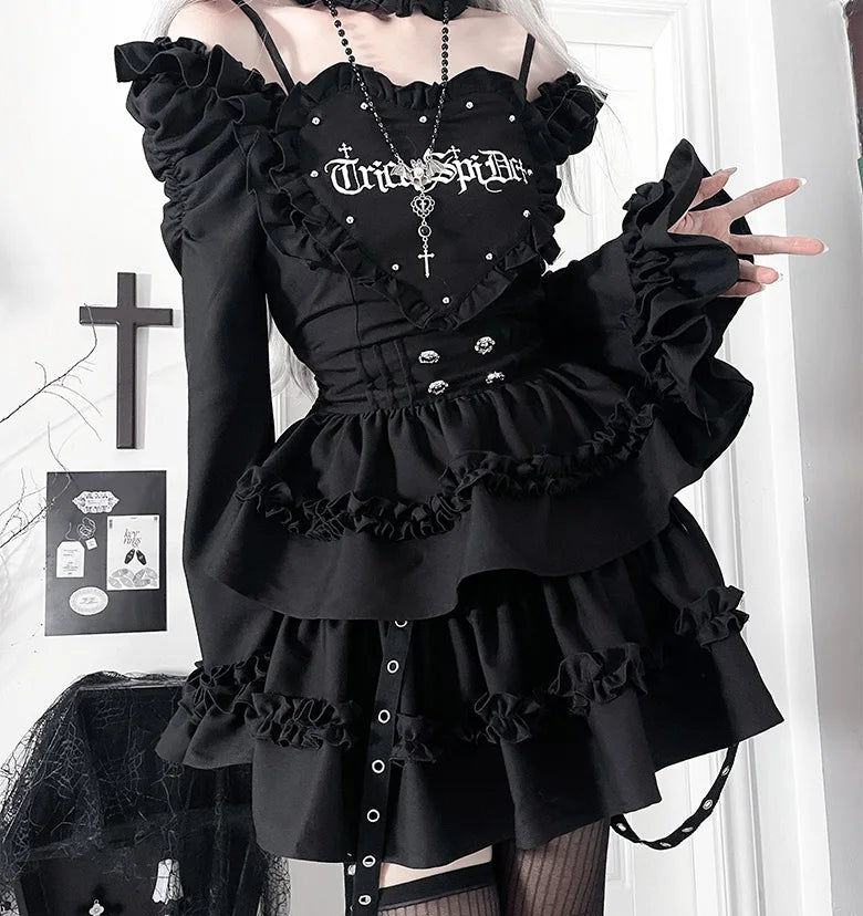 Musta viktoriaaninen goottimekko röyhelöillä ja pitkillä hihoilla