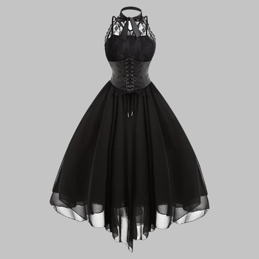 Musta viktoriaaninen hihaton pitsi- ja tyllimekko