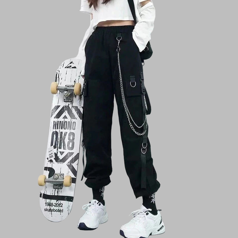 Mustat goottipunk-housut ketjuilla ja cargo-taskuilla, metallityyli