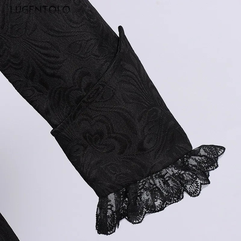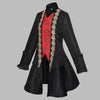 Naisten goottityylinen musta takki punaisella paneelilla ja pitsikoristeilla
