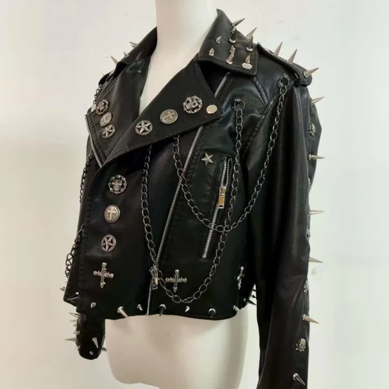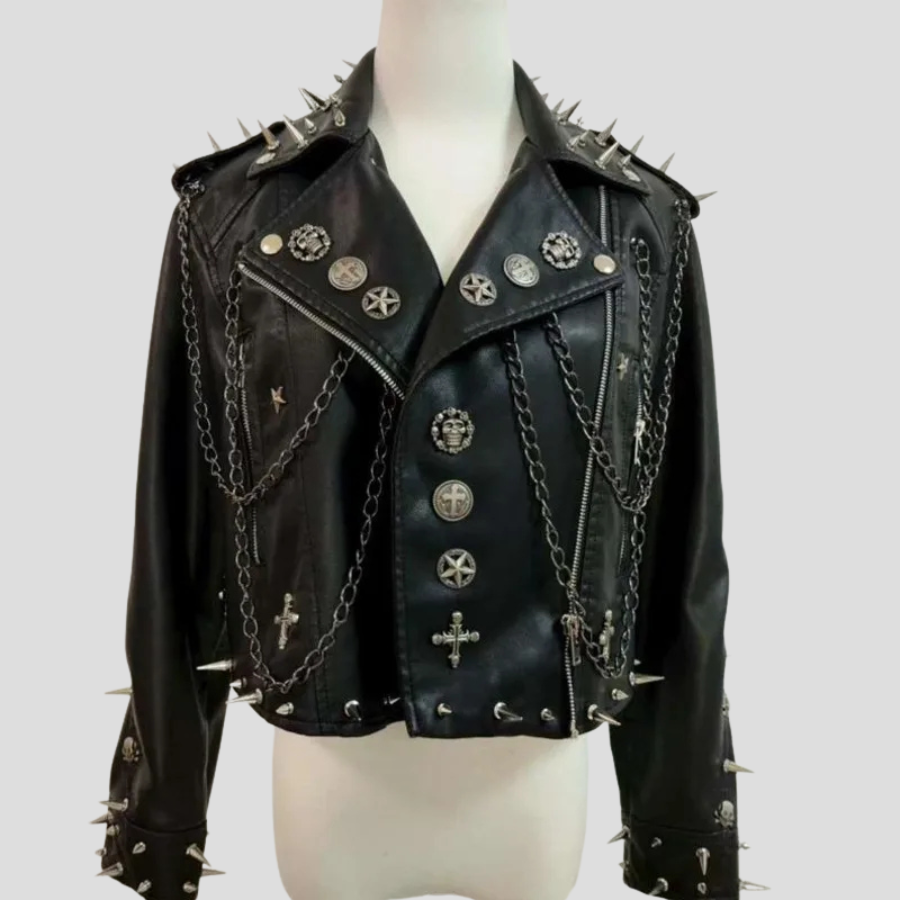 Naisten lyhyt musta punk-takki niiteillä ja ketjuilla