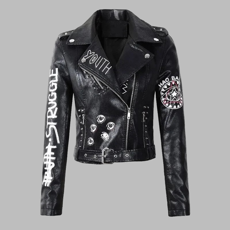Naisten musta punk/goth-nahkatakki niiteillä, teksteillä ja grunge-tyylillä
