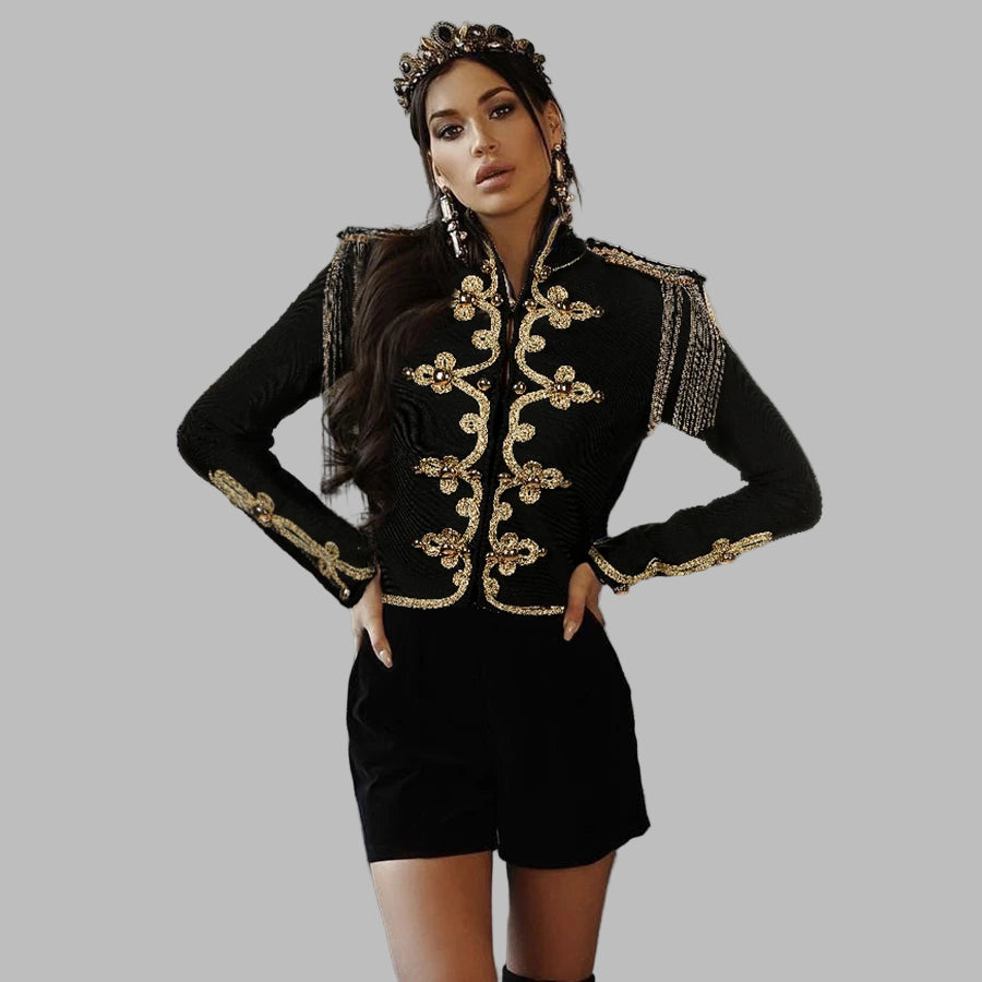 Naisten musta vintage-tyylinen steampunk-sotilastakki kultaisin kirjailuin