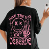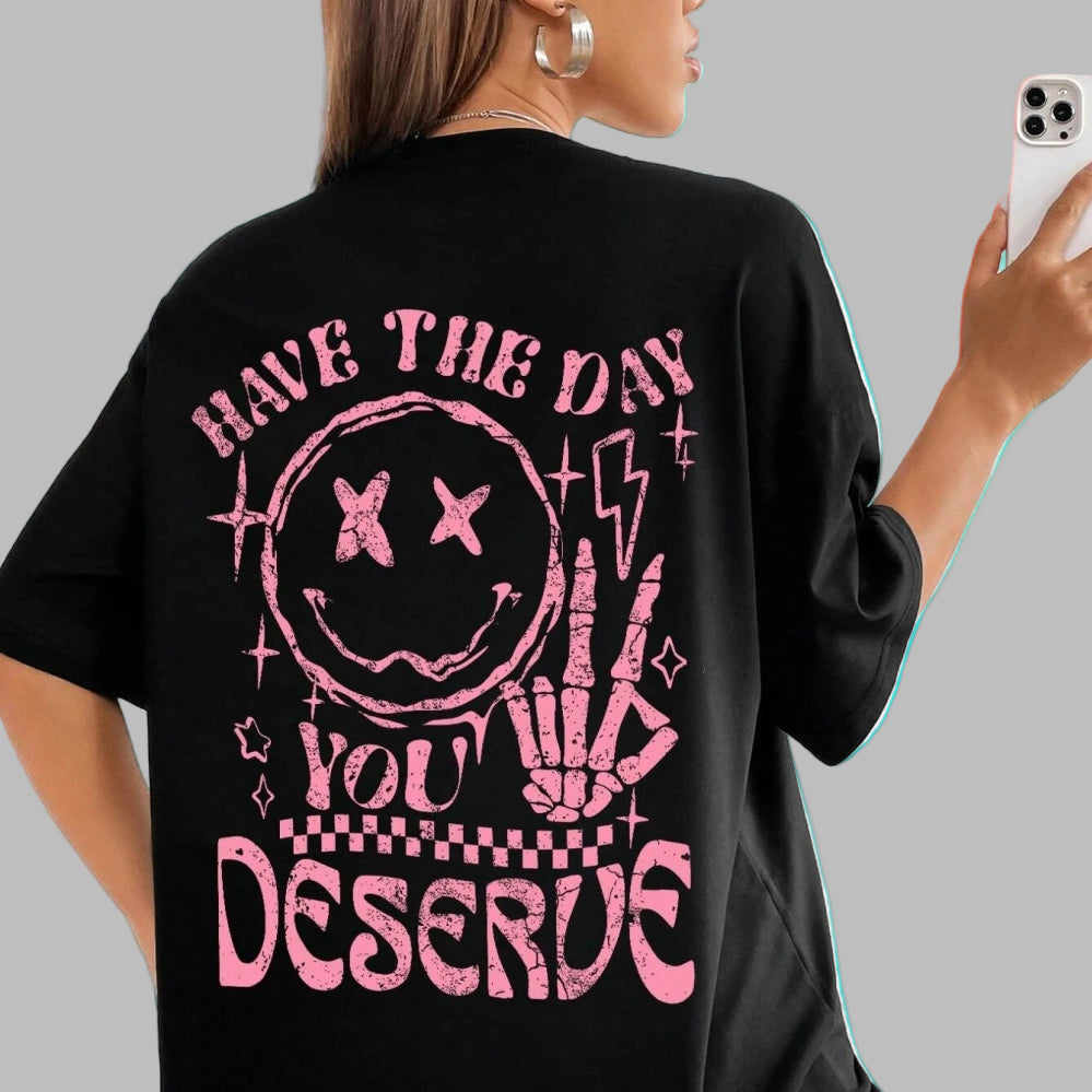 Naisten oversize grunge rock ‑T-paita, vaaleanpunainen smiley-printti