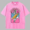 Oversize rock‑T-paita vaaleanpunaisella luurankosurffarikuvalla