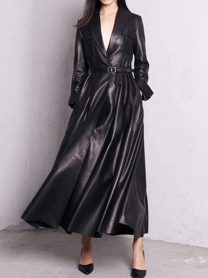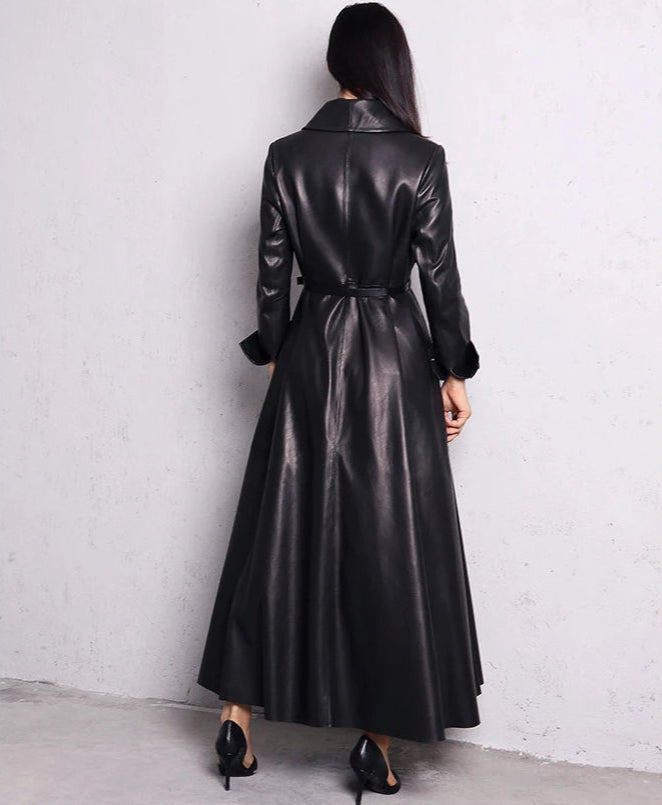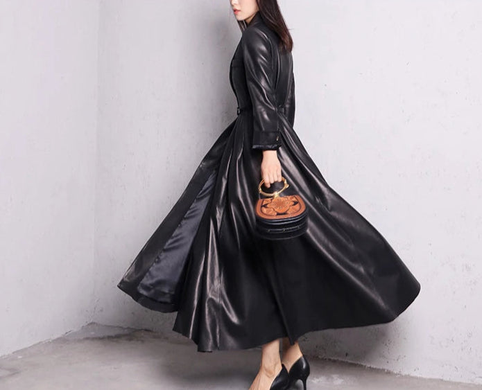 Pitkä musta elegantti nahkatakki, metal goth rock -tyyli
