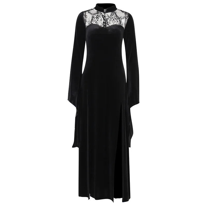 Pitkä musta goottityylinen pitsimekko korkealla halkiolla