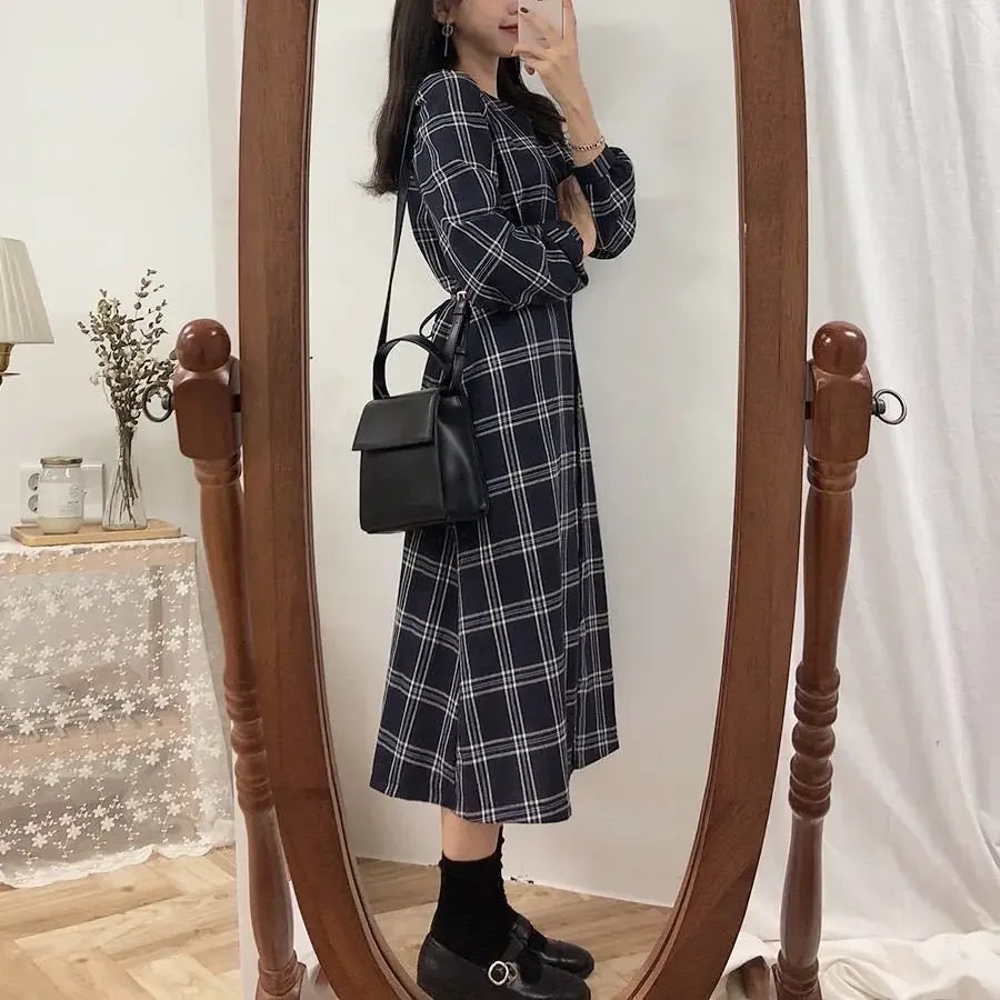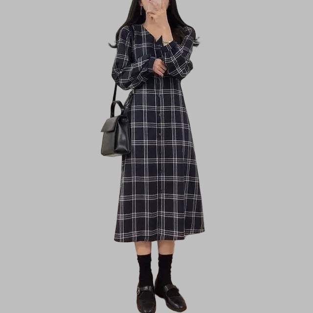 Pitkä musta punk-ruudullinen mekko hihoilla
