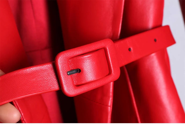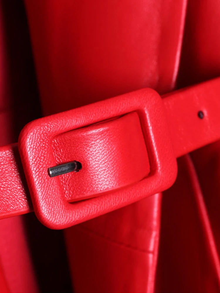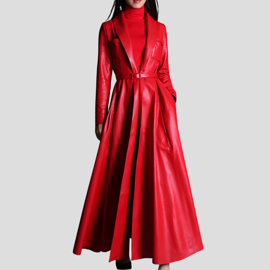 Pitkä punainen rock-tyylinen nahkatakki vyöllä
