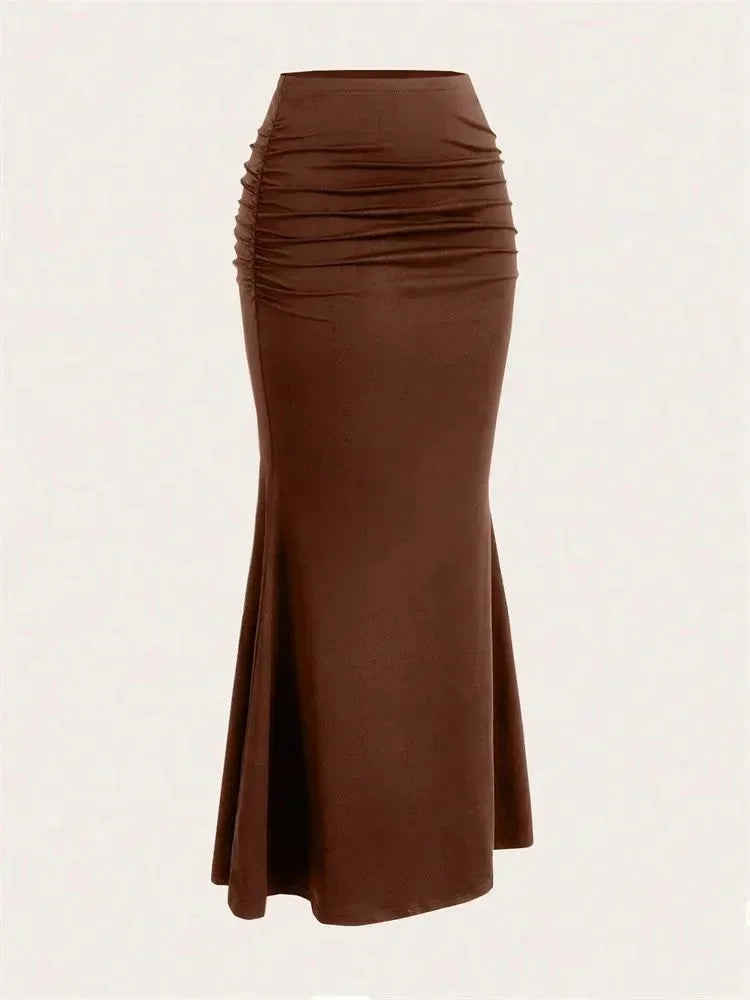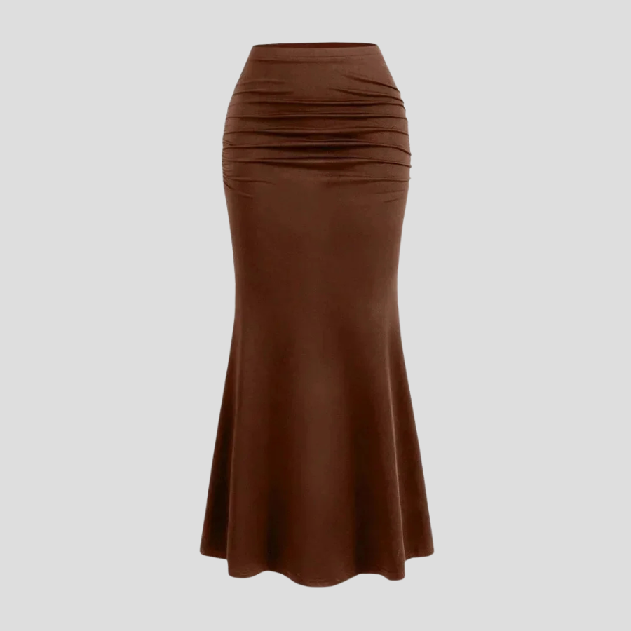 Pitkä ruskea merenneitohelmainen hame, rypytetty vyötärö