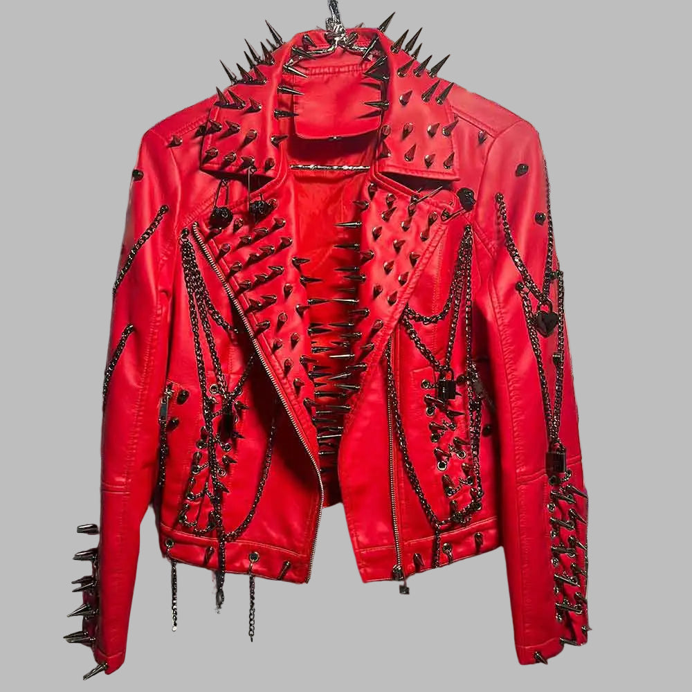 Punainen niittikoristeinen punk-takki ketjuilla Näytä vaihtoehdot